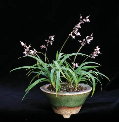 Die Blätter sind flach, 15 bis 30 cm lang, grasartig, dem Schlangenbart (Ophiopogon; siehe {ln:BONSAI ART 091 ‚BONSAI ART 91} ) nicht unähnlich, jedoch nicht rundlich endend, sondern zugespitzt und grün gefärbt. Auch die Blüten ähneln dem Schlangenbart: Sie sind weiß, außen leicht lila angehaucht und bilden wunderschöne kleine Rispen. Die Blütezeit reicht vom Spätsommer bis zum Herbstbeginn. Die kugeligen Früchte werden ca. 4 mm groß.