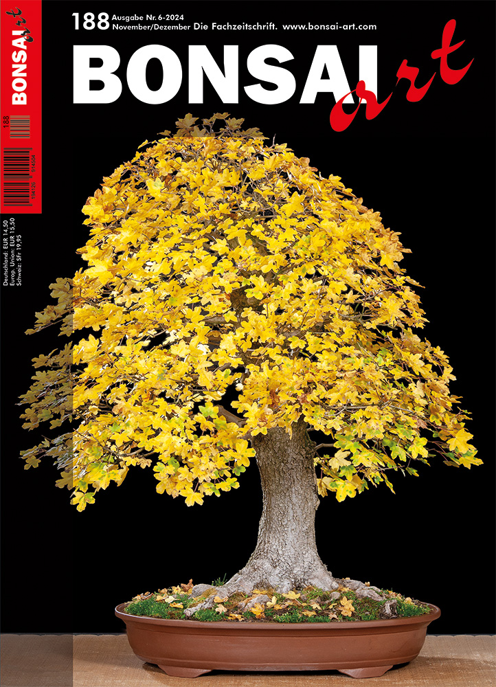 Die Geschichte des Feld-Ahorns auf dem Cover dieser Ausgabe der BONSAI ART begann vor 40 Jahren als Sämling auf dem Acker der Bonsaiwerkstatt in Düsseldorf-Hamm. Gemeinsam mit zahlreichen anderen wurde er im Freiland aufgezogen, um sich durch starkes Wachstum und regelmäßige Eingriffe zu gutem Bonsai-Rohmaterial zu entwickeln. Seit ca. 20 Jahren steht der Baum jetzt in einer Bonsai-Schale und seit 10 Jahren ist er im Bonsai-Museum Düsseldorf zu sehen.