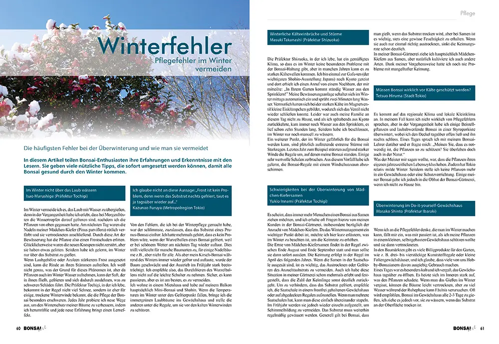 Die Geschichte des Feld-Ahorns auf dem Cover dieser Ausgabe der BONSAI ART begann vor 40 Jahren als Sämling auf dem Acker der Bonsaiwerkstatt in Düsseldorf-Hamm. Gemeinsam mit zahlreichen anderen wurde er im Freiland aufgezogen, um sich durch starkes Wachstum und regelmäßige Eingriffe zu gutem Bonsai-Rohmaterial zu entwickeln. Seit ca. 20 Jahren steht der Baum jetzt in einer Bonsai-Schale und seit 10 Jahren ist er im Bonsai-Museum Düsseldorf zu sehen.