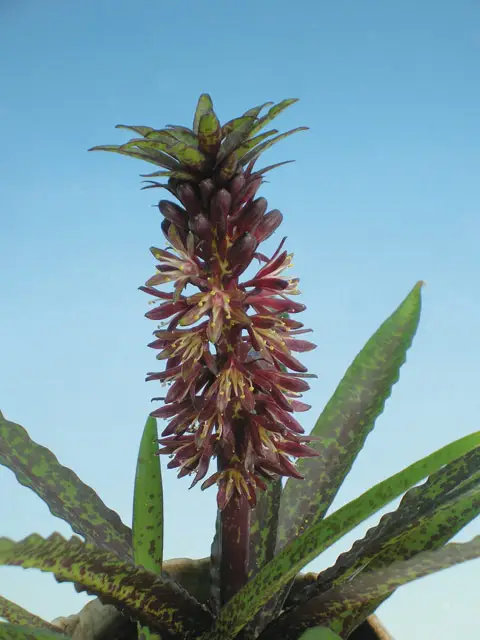 Eucomis bicolor: Sie erreicht eine Länge von 50 cm und wird kaum breiter als 10 cm. Die einzelnen Blüten werden gelbgrün. Hauptblütezeit ist im Sommer.