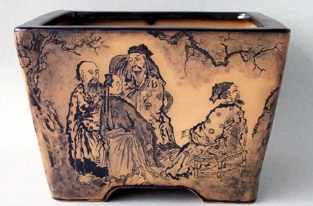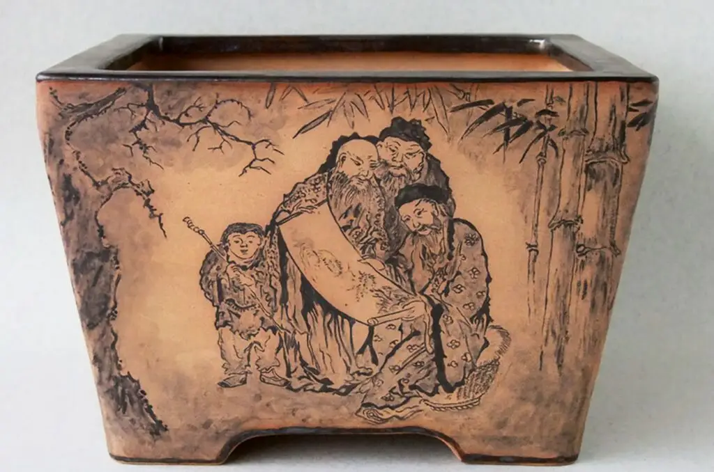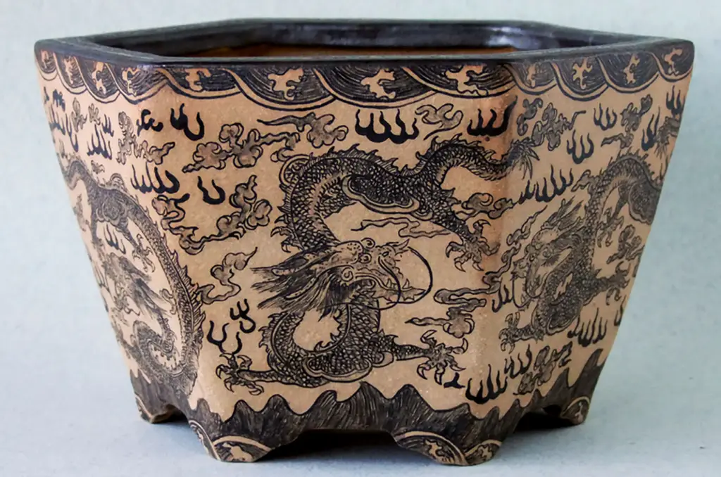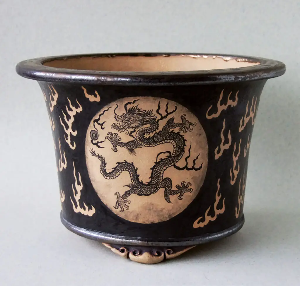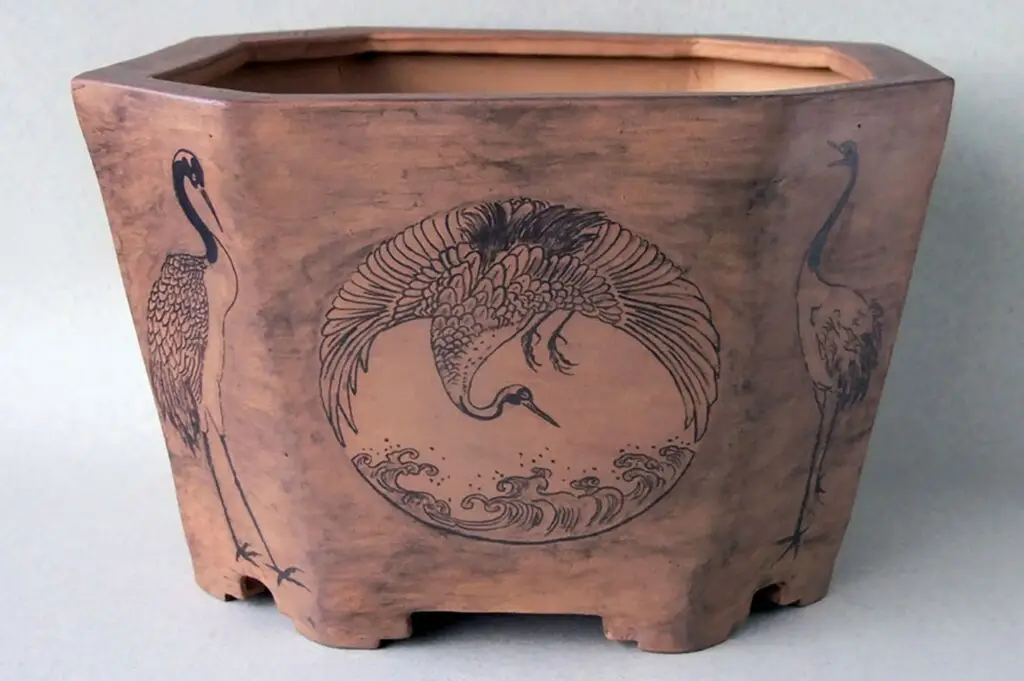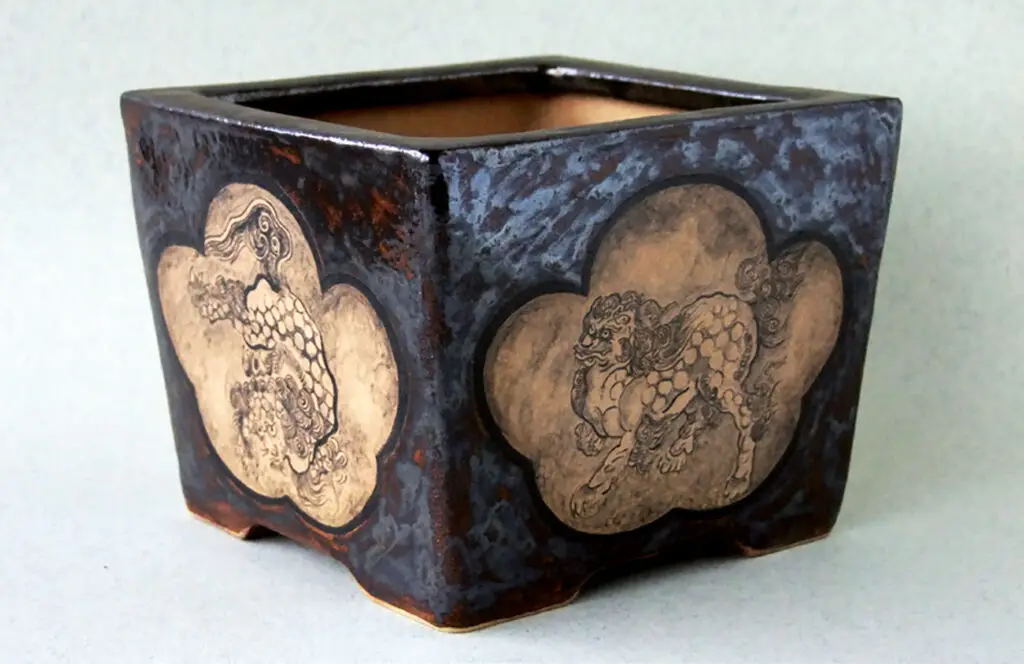 Seine künstlerische Begabung erlaubte es ihm, alle bekannten Dekorationsarten auszuprobieren und zu meistern. Ob Schnitztechnik, Intarsien, Engobe-, Glasurmalerei, aufmodellierte Reliefs, unglasierte Schalen mit besonderen Oberflächen oder selbst entwickelte Glasuren, die Schalen von Peter Krebs waren schon immer von auffallend hoher Qualität und entsprechend begehrt bei anspruchsvollen Bonsai-Freunden.