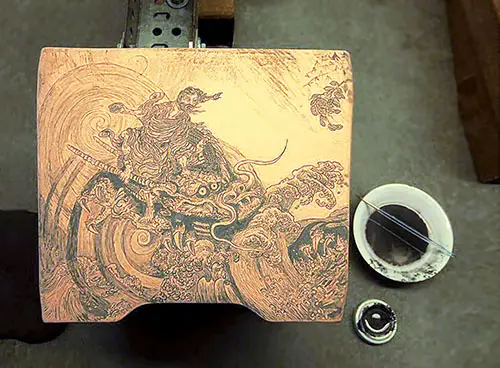 Zu den japanischen Töpfern kann ich leider keine Aussage treffen. Mein Vorteil ist, dass ich mich kulturell nicht gebunden fühle und völlig frei agieren kann. So kommt es dann auch schon vor, dass auf der einen Seite der Schale ein eher chinesisches Motiv und auf der anderen ein japanisches Motiv zu sehen ist. Meine Ideen und Vorbilder beziehe ich aus den oben genannten Interessen. Ich habe, wie gesagt, schon seit meiner Jugendzeit asiatische Motive und Bilder gesammelt. Vor einigen Jahren habe ich diesen ganzen Schatz digitalisiert, damit es leichter wird, darauf zurückzugreifen. Ich habe sie noch nicht gezählt, aber mein PC sagt mir eine Zahl von über 5.000.