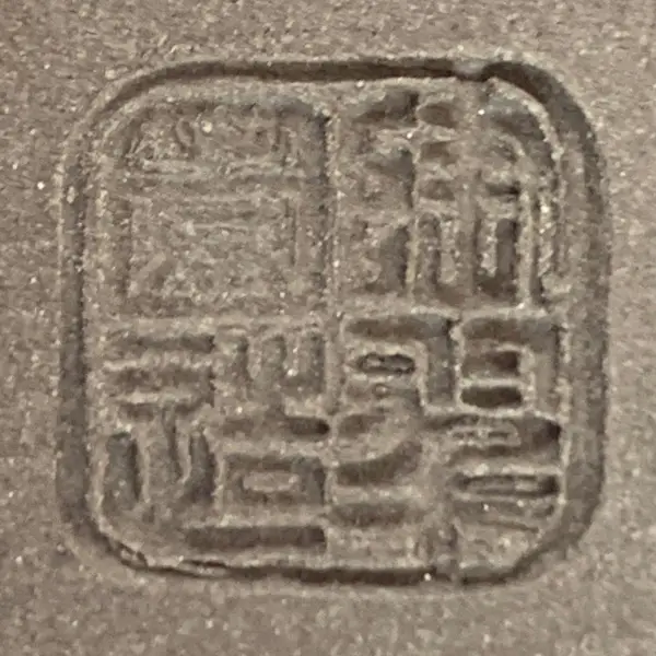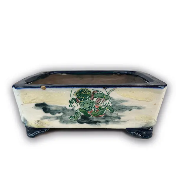 Tosui hat eine lange Tradition, die sich bereits über etwa 100 Jahre hinzieht. Die hier betrachtete Schale wurde von Shikao Mizuno hergestellt, der 1942 geboren wurde und als dritte Generation der Tosui-Töpfer gilt. Er hat eine Vielzahl von glasierten, unglasierten und bemalten Schalen hergestellt, die sich mit Recht großer Beliebtheit erfreuen und noch immer rege gehandelt werden. Die bemalten Stücke sind, wie auch in diesem Fall, meistens aus braunem Ton hergestellt und mit einer hellen Glasur versehen, auf welche dann die farbigen Motive aufgemalt wurden. Die Malereien zeigen klassische Motive wie Landschaften, den Berg Fuji, Menschen in verschiedenen Szenen, Tiere oder auch die bekannte „Fuchshochzeit“. In diesem Fall sind auf den beiden langen Seiten der Schale zwei Shinto-Gottheiten abgebildet, die meist zusammen zu sehen sind. Fujin, der grün dargestellte Gott des Windes, mit seinem über den Kopf gehaltenen Sack voller Windböen, springt vor dem Hintergrund einer grau-schwarzen Wolke daher. Sein Bruder Raijin, der Gott des Donners, ist von einem Ring mit Trommeln umgeben, die er mit den Stöcken in seinen Händen schlägt. Diese beiden Gottheiten sind einerseits gefürchtete, zerstörerische Unruhestifter, andererseits werden sie aber auch als Schutzgötter betrachtet und in Trockenzeiten um Regen gebeten. Auf den kurzen Seiten der Schale sind bergige Landschaften in blau-grüner Farbe angedeutet und einige Schriftzeichen, die „Windgott“ und „Donnergott“ lauten. Die Form der Schale ist rechteckig mit leicht eingezogenen Ecken, minimal nach oben weiter werdender Wand und Wolkenfüßen. Die Maße der Schale betragen 12 cm mal 9 cm, bei einer Höhe von 3,7 cm plus 1 cm Fußhöhe. Der leicht nach innen gezogene Rand ist 7 mm breit und dunkelblau glasiert, ebenso wie die Füße. Obwohl diese Schale offenbar noch nie bepflanzt war, hat sie zwei kleine, punktförmige, goldene Kintsugi-Reparaturen am oberen Rand. Die allgemeine Machart dieses Exemplars ist ein wenig unregelmäßig und sowohl die Innenseite als auch die Unterseite des Schalenbodens sind nicht allzu sorgfältig geglättet, aber dies tut dem Charme der kleinen Shohin-Schale keinen Abbruch. Sie eignet sich für einen ausdrucksvollen kleinen Laubbaum oder einen blühenden beziehungsweise fruchtenden Baum mit einem etwas wettergegerbten Aussehen.