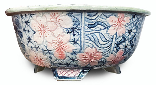Kirschblüten auf einer Bonsai-Schale stellen also ein dekoratives Motiv dar, das in der japanischen Kultur und