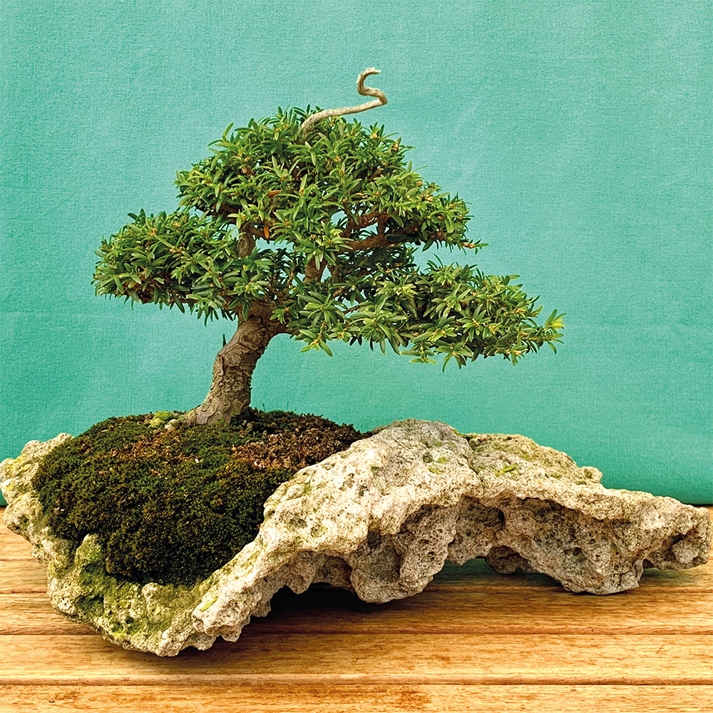 Wolfgang Weber erzählt: „Ich fand diese Eibe im Jahr 2006 als Sämling in meiner Gartenhecke. Meine Idee war, ihr etwas höher am Stamm neue Wurzeln wachsen zu lassen und die Krone des zukünftigen Shohin-Bonsai nur aus dem ersten Ast zu gestalten. Die Abmoosung gelang tadellos und schnell. Sehr erfreulich sind die ungewöhnlich kurzen Nadeln der kleinen Eibe. Eindeutige Höhepunkte waren dann 2020 die Pflanzung in den Stein und 2024 ihre Präsentation auf der Trophy. Die Eibe ist aus meiner Erfahrung die beste einheimische Nadelbaumart für die Bonsai-Gestaltung.“